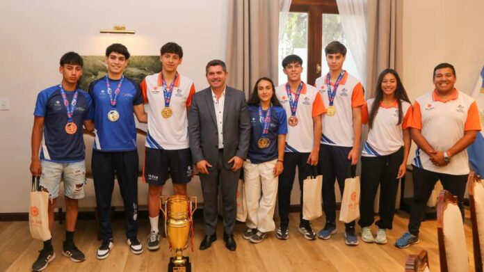 El gobernador de San Juan, Marcelo Orrego, recibió en Casa de Gobierno a deportistas sanjuaninos que recientemente tuvieron participaciones destacadas en certámenes a nivel mundial y nacional. El mandatario, junto al ministro de Turismo, Cultura y Deporte, Guido Romero; secretario de Deportes Provincial, Pablo Tabachnik; subsecretario Mauricio Lara y director, Martín Riveros, compartió un grato momento con los atletas, a quienes agradeció y felicitó, instándolos a seguir mostrando el rendimiento de los jóvenes sanjuaninos en las vidrieras deportivas más importantes.
