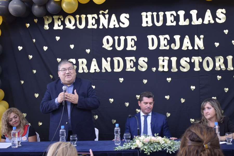 El intendente David Domínguez participó del Acto de Inauguración de la ENI 81 Huellitas de Amor, en el barrio Grimalt, acompañado por el gobernador Marcelo Orrego, la ministra de Educación Silvia Fuentes y el ministro de Infraestructura, Agua y Energía Fernando Perea.